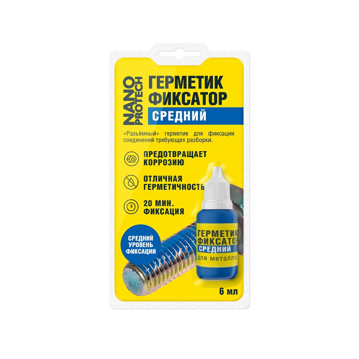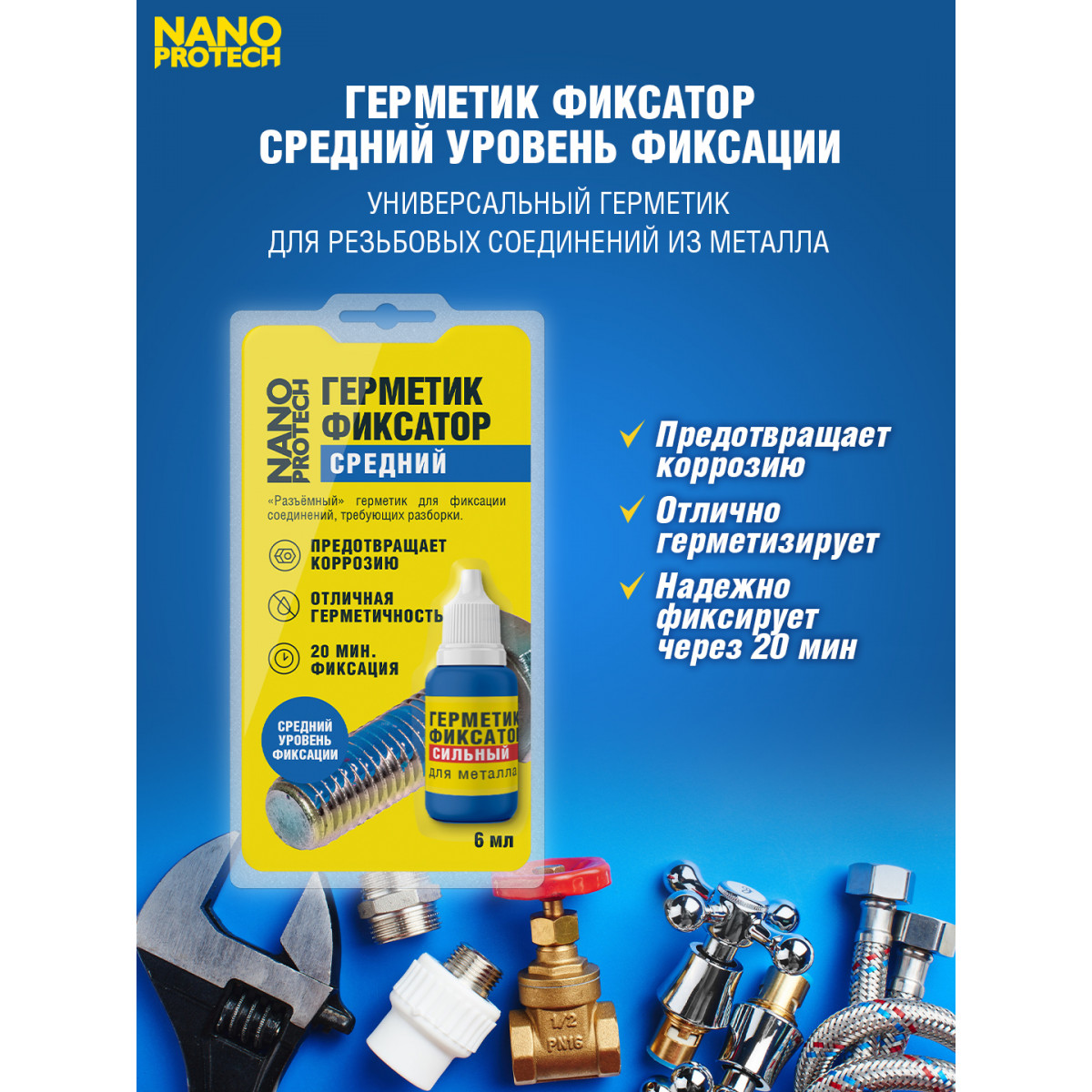 Герметик - фиксатор средний NANOPROTECH, универсальный герметик для резьбовых соединений из металла, средний уровень фиксации. «Разъёмный» для соединений, требующих регулировки и разборки. Герметизирует и придаёт вибростойкость. Рекомендуется для резьбы до М20. Момент откручивания не более 17 Н м. Идеальное решение для сантехники, ремонта автомобилей, электроприборов, спортинвентаря.