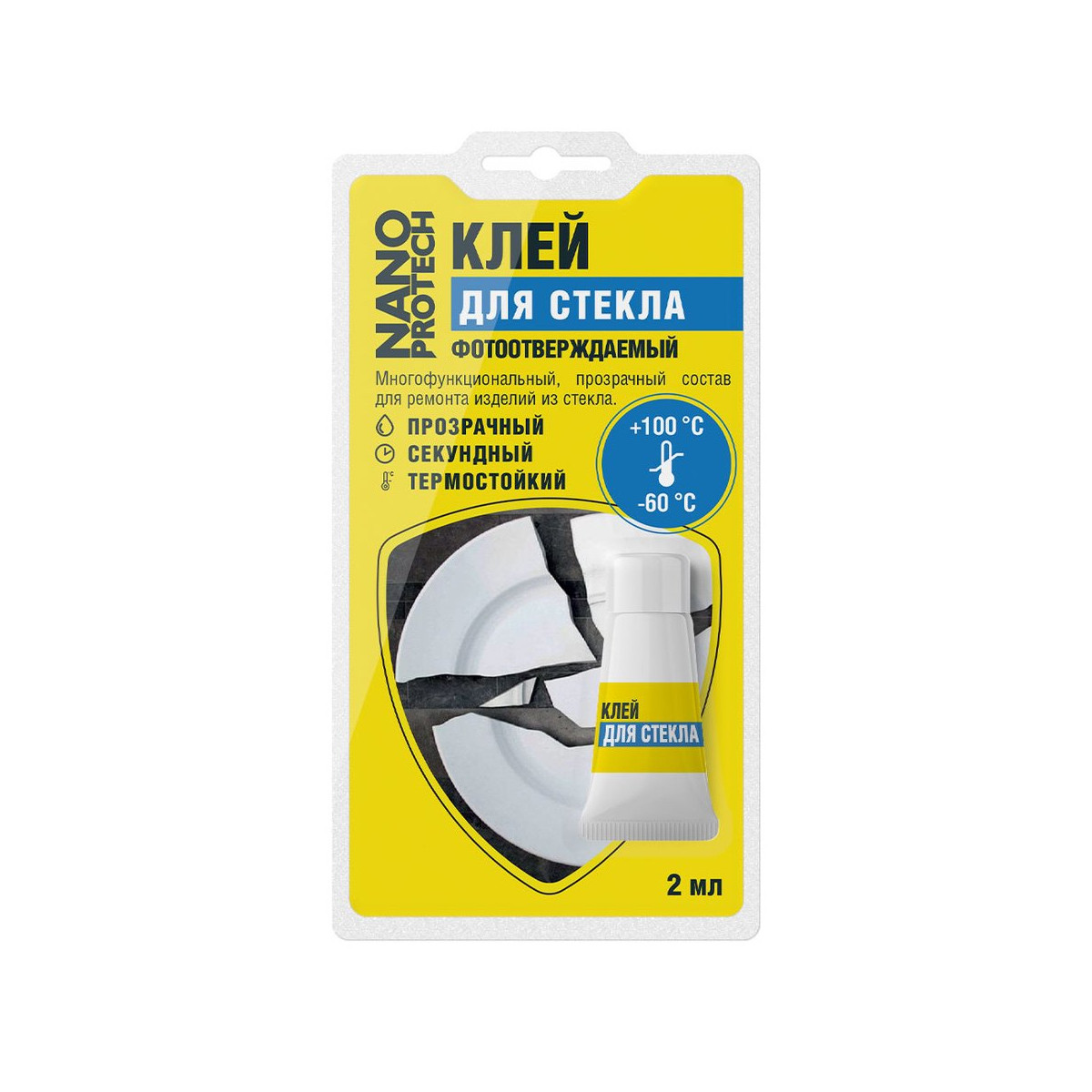 Клей для стекла фотоотверждаемый NANOPROTECH, прозрачный состав для ремонта изделий из стекла. Работает при солнечном свете или UVлампы. Обладает высокой устойчивостью к воздействию температуры, воды и вибрациям. Надёжно и быстро склеивает стекло (прозрачное, окрашенное, закалённое), хрусталь, бижутерию, оргстекло, фарфор, керамику, стекло с металлом, деревом, пластиком. Идеально подходит для ремонта трещин лобового стекла, приклеивания зеркал заднего вида. А также для ремонта посуды, после чего её можно использовать в посудомойке, свч печи, в духовке.