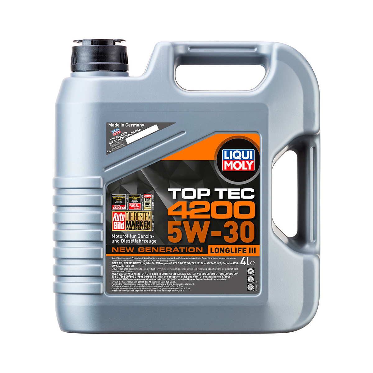 LIQUI MOLY НС-синтетическое моторное масло Top Tec 4200 5W-30, рекомендуется для широкого круга современных двигателей европейских автопроизводителей, таких как Volkswagen-Audi (за исключением R5 TDI и V10 TDI, выпущенных до 06.2006, для которых подходит Synthoil Longtime Plus 0W-30); Mercedes-Benz; BMW; Fiat (дизели с 2008 модельного года); Mitsubishi, Peugeot/ Citroen (с модельного года 1999). Отлично подходит для большинства современных дизельных автомобилей корейского производства с сажевыми фильтрами (DPF).