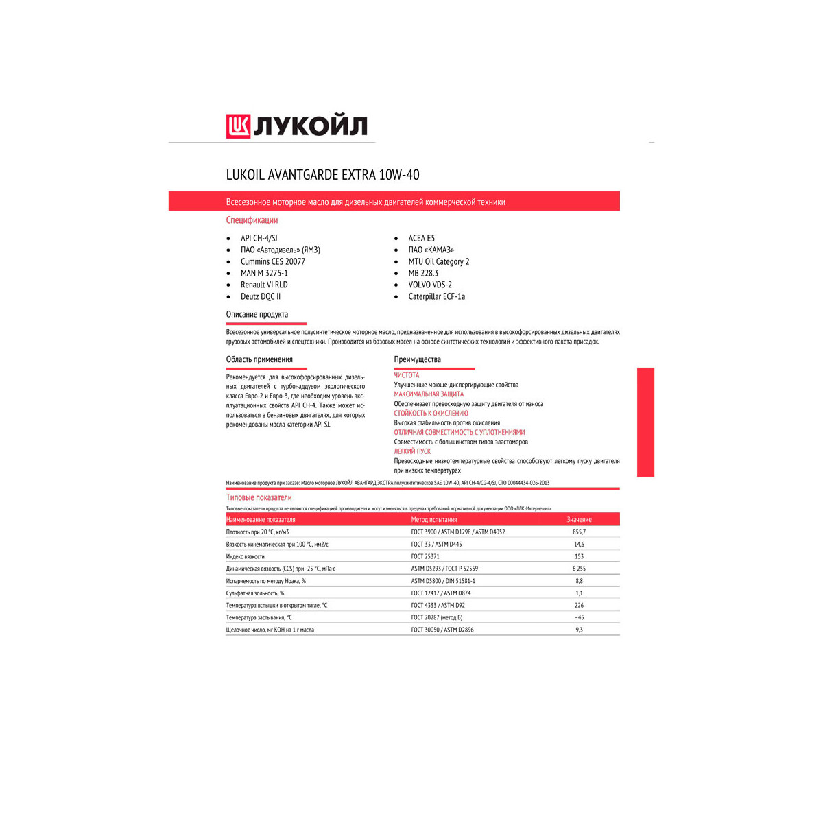 - обеспечивает надежную защиту двигателя от износа, коррозии и образования высокотемпературных отложений в жестких условиях эксплуатации.