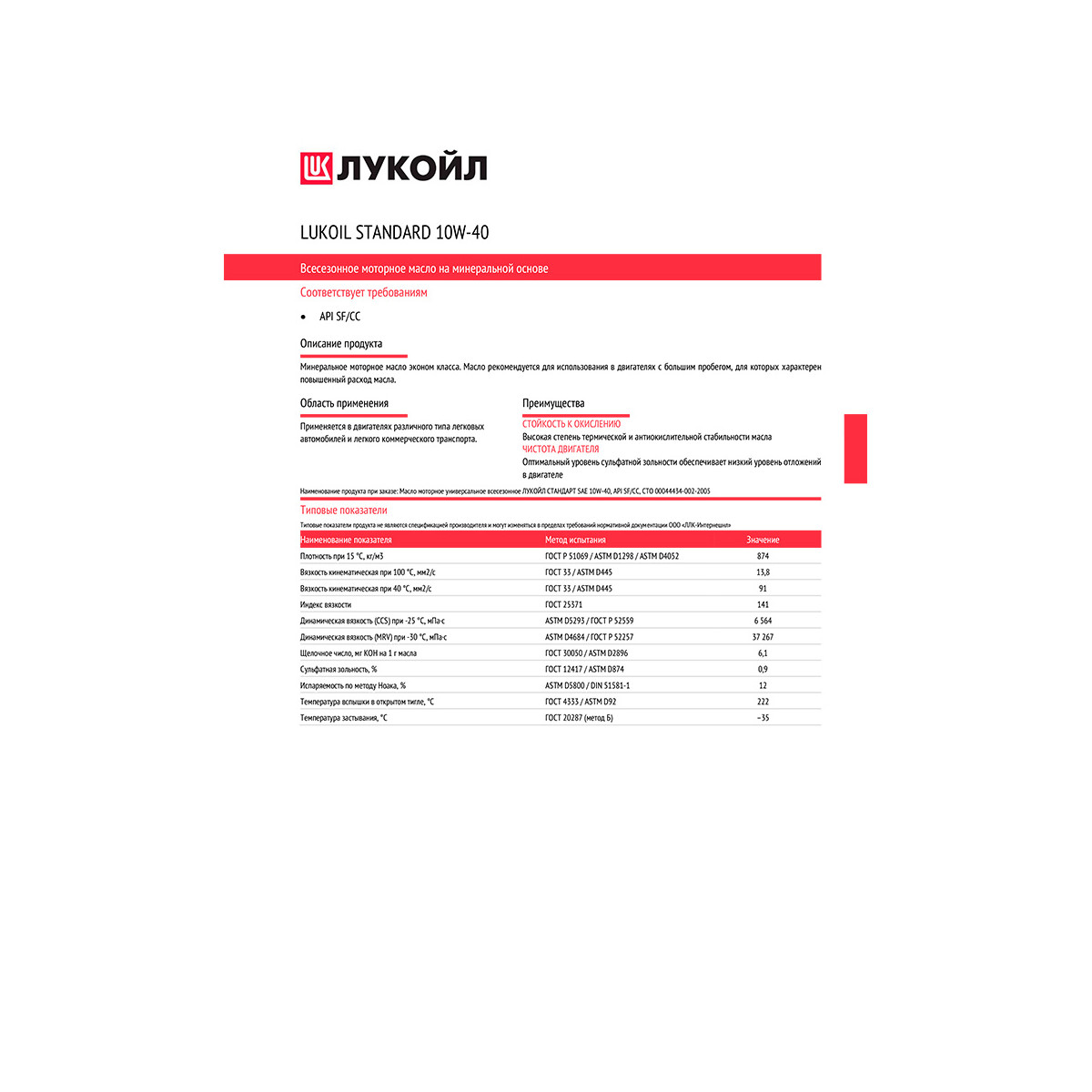 Моторное масло LUKOIL СТАНДАРТ 10W-40 API SF/CC - минеральное масло , которое идеально подходит для машин с серьезным пробегом. Для таких авто необходимы специфические характеристики моторного масла. Масляная пленка должна быть толще и плотнее, чем для новых автомобилей.