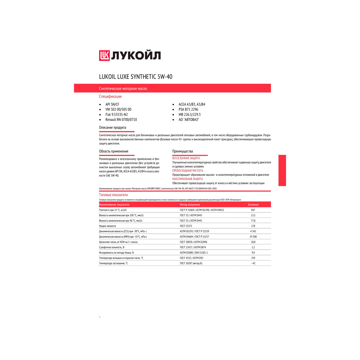 LUKOIL LUXE SYNTHETIC 5W-40, API SN/CF - синтетическое моторное масло для бензиновых и дизельных двигателей легковых автомобилей. Разработано на основе высококачественных компонентов, обеспечивающих превосходную защиту двигателя.