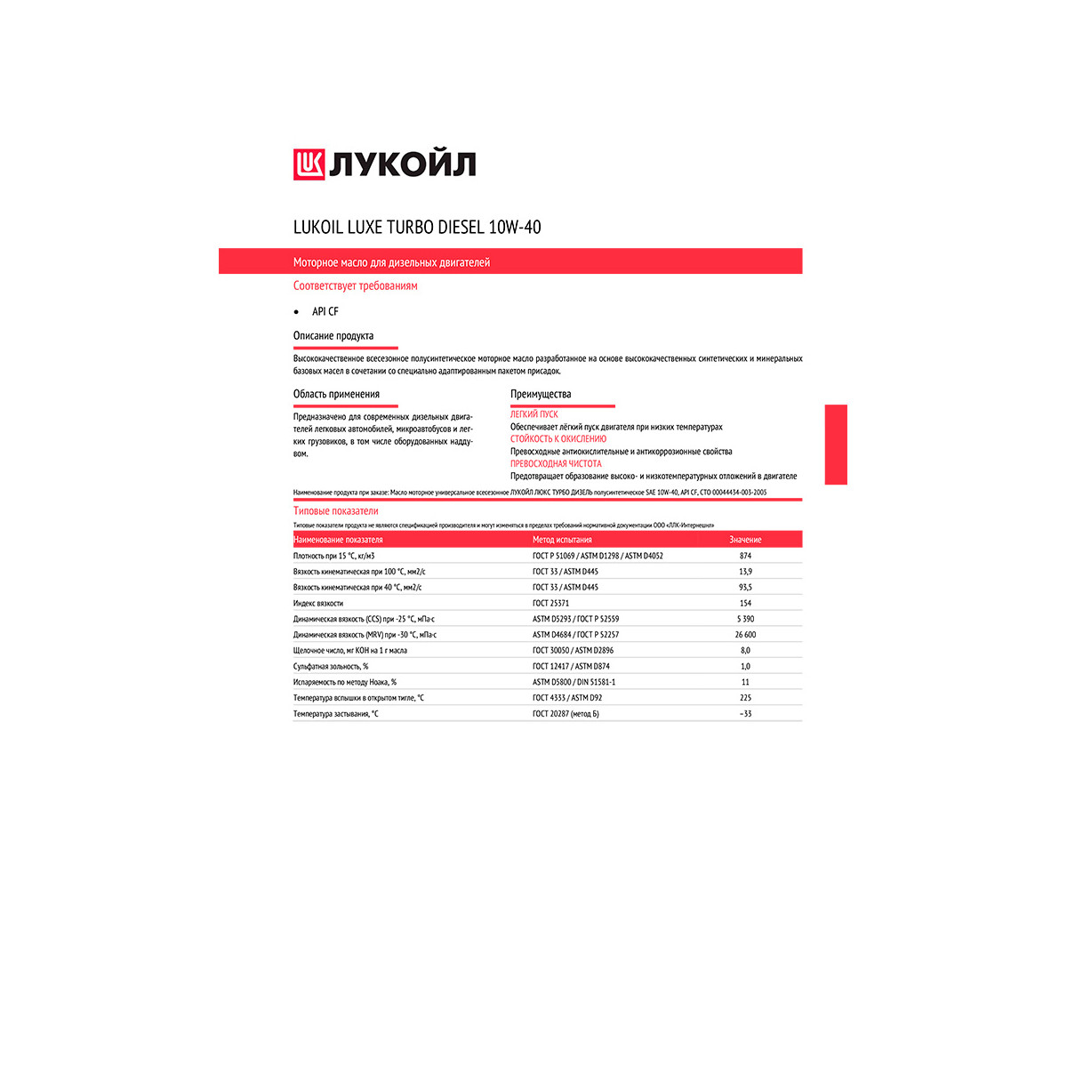 LUKOIL ЛЮКС ТУРБО ДИЗЕЛЬ 10W-40 API CF - высококачественное всесезонное полусинтетическое моторное масло. Предназначено для современных дизельных двигателей с турбонаддувом легковых автомобилей, микроавтобусов и легких грузовиков. Специально разработано для дизельных двигателей, работающих на топливе с высоким содержанием серы.