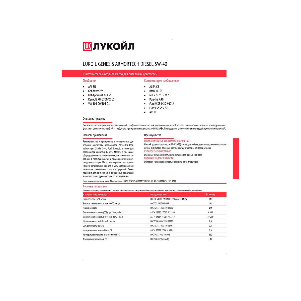 Масло моторное Лукойл GENESIS ARMORTECH DIESEL 5W-40 - синтетическое моторное масло с пониженной сульфатной зольностью для дизельных двигателей легковых автомобилей, в том числе оборудованных фильтром сажевых частиц (DPF) и требующих применения масел класса «Mid SAPS». Производится с применением передовой технологии DuraMax®.